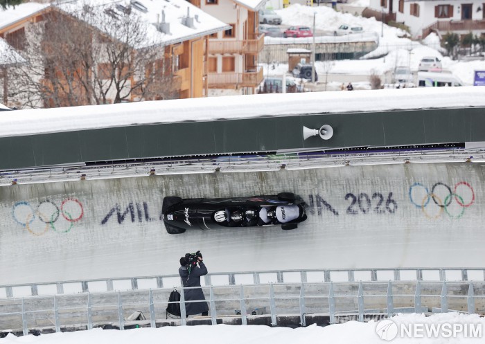 [코르티나담페초=로이터뉴스핌] 밀라노 코르티나 2026 올림픽에 출전한 봅슬레이 대한민국 대표팀이 22일 이탈리아 코르티나담페초 코르티나 슬라이딩 센터에서 경기를 펼치고 있다. 2026.02.22 photo@newspim.com