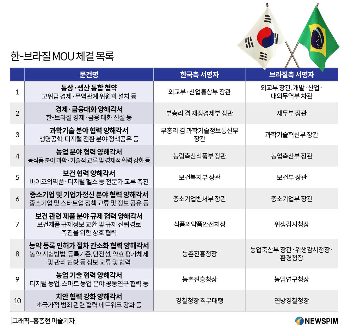 이 대통령은 "보건 분야 규제 협력 MOU를 통해 최근 브라질에서 인기를 끌고 있는 K-화장품이 더 많은 브라질 국민의 사랑을 받게 될 것"이라며 "농업 분야에서도 3개의 MOU를 체결했는데 농업 대국이자 선진 농업 기술 보유국인 브라질과의 협력은 대한민국 식량 안보를 위해 매우 중요한 과제"라고 강조했다.