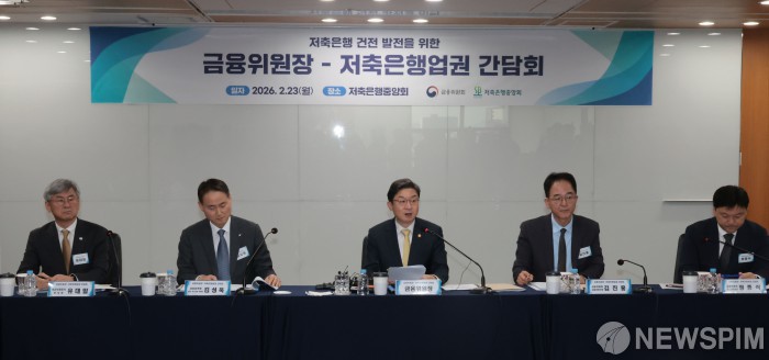 [서울=뉴스핌] 이길동 기자 = 이억원 금융위원장이 23일 서울 마포구 저축은행중앙회에서 열린 저축은행 CEO 간담회를 주재하며 모두 발언을 하고 있다.2026.02.23 gdlee@newspim.com
