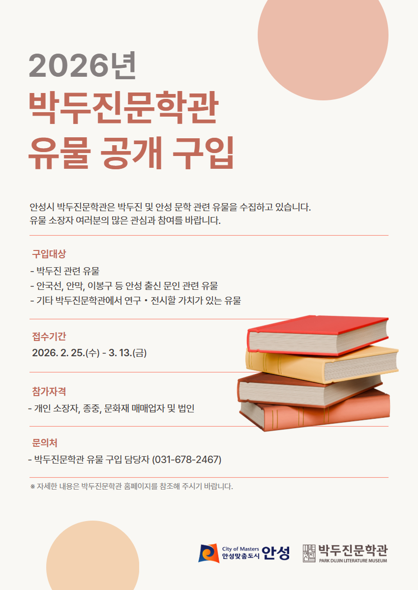 [안성=뉴스핌] 이석구 기자 = 경기 안성시는 박두진문학관이 2026년 전시·교육 및 연구 자료로 활용하기 위해 박두진 관련 유물과 안성 출신 문인 유물을 공개로 구입한다고 23일 밝혔다.
