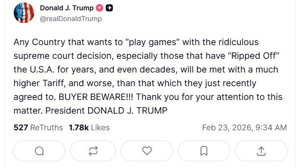 트럼프 대통령은 23일(현지시간) 소셜미디어 트루스 소셜에 글을 올려 "터무니없는 대법원의 판결을 이용해 '장난질(Play games)'을 치려는 국가들, 특히 오랫동안 미국을 뜯어먹은(ripped off) 국가들은 최근 합의한 것보다 훨씬 더 높은 관세와 혹독한 대우를 받게 될 것"이라고 경고했다. 그는 이어 상거래에서 '구매자 책임'을 강조할 때 쓰는 문구인 "구매자 주의(BUYER BEWARE!!!)"를 덧붙이며, 미국과의 합의를 가볍게 볼 경우 책임은 상대국에 있다며 "나중에 크게 후회할 수 있다"는 위협성 메시지를 노골적으로 발신했다.