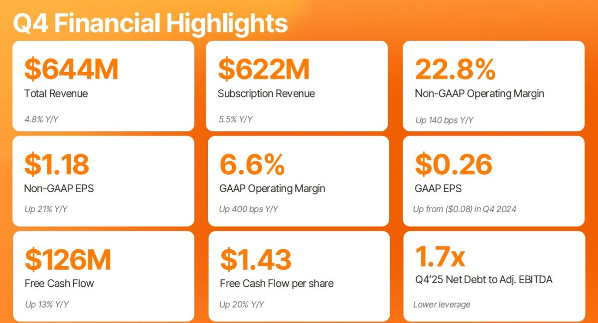 4분기만을 놓고 보아도 실적은 견조했다. 4분기 매출은 6억 4400만 달러로 전년 동기 대비 4.8% 성장했으며, 비GAAP 기준 주당순이익(EPS)은 1.18달러를 기록해 월가 컨센서스 예상치인 1.13달러를 상회했다. 4분기 비GAAP 기준 영업이익은 1억 4670만 달러로 전년 동기 대비 11.8% 증가했으며, 영업이익률은 140bp 상승한 22.8%에 달했다.