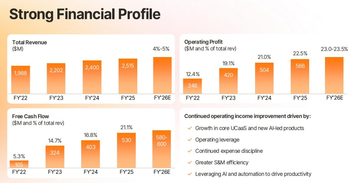 이를 뒷받침하는 수치도 탄탄하다. 링센트럴의 2025년 잉여현금흐름(FCF)은 5억 달러를 돌파하며 전년 대비 32% 급증했고, 주당 잉여현금흐름은 5.81달러로 36% 늘었다. 이는 회사가 배당과 자사주 매입을 동시에 지속하면서도 부채 상환에 나설 수 있는 충분한 재원을 확보했음을 의미한다.