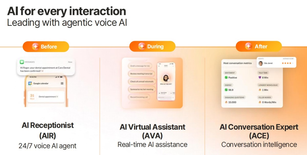 'AVA(AI 버츄얼 어시스턴트)'는 중규모 기업에서 선호되는 실시간 AI 어시스턴트로 포지셔닝되고 있으며, 'ACE(AI 컨버세이션 엑스퍼트, AI 통화 후 분석)'는 통화 내용을 자동으로 분석·요약하는 기능으로 전 부문에서 광범위하게 채택되고 있다. 이 삼각 구조는 중소기업부터 대기업까지 전 고객층을 아우르는 AI 수익화 파이프라인을 형성한다.