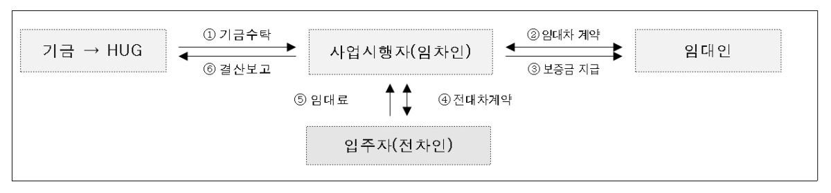 LH가 운영하는 전세임대주택의 재원은 HUG가 관리하는 주택도시기금이다. LH는 주택도시기금을 활용해 임대인에게 임대보증금을 지급하고 주택을 확보한다. 이를 전대차계약을 통해 입주자에게 제공하고 임대료를 받는다.