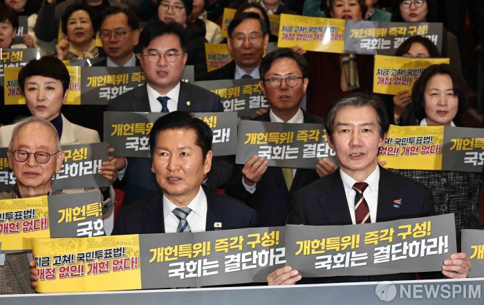 [서울=뉴스핌] 윤창빈 기자 = 우원식 국회의장, 정청래 더불어민주당 대표, 조국 조국혁신당 대표, 강기정 광주광역시장, 김영록 전라남도지사 등 참석자들이 25일 국회 의원회관에서 열린 5·18정신 헌법전문수록 개헌 촉구 국민결의대회에서 피켓을 들고 기념촬영을 하고 있다. 2026.02.25 pangbin@newspim.com