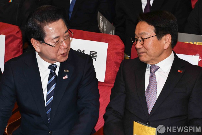 [서울=뉴스핌] 윤창빈 기자 = 김영록 전라남도지사, 강기정 광주광역시장이 25일 국회 의원회관에서 열린 5·18정신 헌법전문수록 개헌 촉구 국민결의대회에서 대화를 나누고 있다. 2026.02.25 pangbin@newspim.com