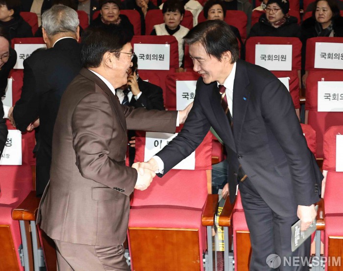 [서울=뉴스핌] 윤창빈 기자 = 우원식 국회의장, 조국 조국혁신당 대표가 25일 국회 의원회관에서 열린 5·18정신 헌법전문수록 개헌 촉구 국민결의대회에서 인사를 나누고 있다. 2026.02.25 pangbin@newspim.com