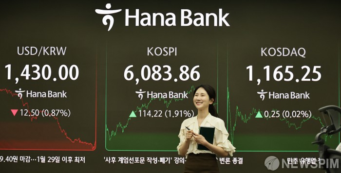 한국거래소에 따르면 이날 코스피 지수는 전 거래일 대비 114.22포인트(1.91%) 오른 6083.86에 거래를 마쳤다. 개인과 기관이 각각 6434억원, 6759억원을 순매수하며 지수를 끌어올렸고, 외국인은 1조5009억원을 순매도했다.