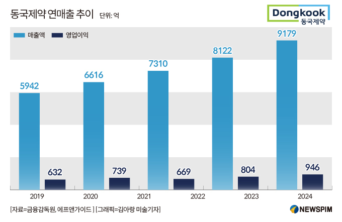 25일 금융정보업체 에프앤가이드에 따르면 동국제약의 지난해 연결기준 매출은 9172억원, 영업이익은 970억원을 기록했을 것으로 추정된다. 이는 전년 대비 각각 12.9%, 17.7% 증가한 수치로 회사 창립 이후 역대 최대 실적이 될 전망이다.