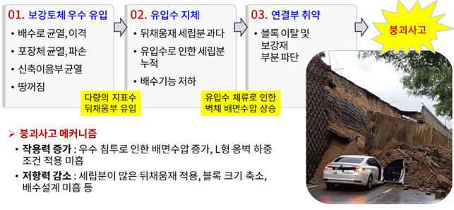 조사 결과 보강토옹벽 상부 배수로와 포장면 균열을 통해 빗물이 지속적으로 유입되면서 뒤채움재(강토옹벽의 뒤쪽 공간을 채우는 흙)가 약화됐고, 상단에 설치된 L형 옹벽 침하되면서 포장면 땅꺼짐과 균열이 발생했다. 이후 집중호우로 유입수가 급증했지만 내부 배수 기능이 제대로 작동하지 않으면서 수압이 가중돼 붕괴된 것으로 분석됐다.