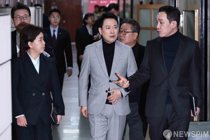 [서울=뉴스핌] 윤창빈 기자 = 장동혁 국민의힘 대표와 최고위원들이 26일 오전 서울 여의도 국회에서 열린 최고위원회의에 참석하고 있다. 2026.02.26 pangbin@newspim.com