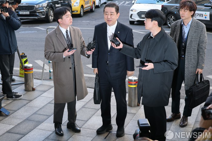 [서울=뉴스핌] 류기찬 기자 = 13가지 의혹을 받는 김병기 무소속 의원이 26일 오전 서울 마포구 서울경찰청 공공범죄수사대에 경찰 조사를 받기 위해 출석하며 입장을 밝히고 있다. 2026.02.26 ryuchan0925@newspim.com