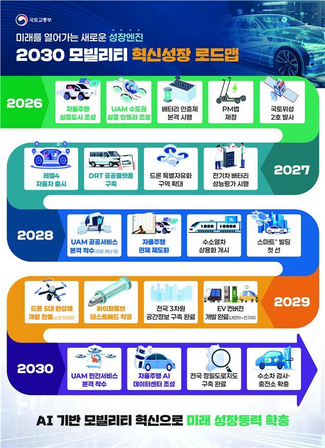 26일 국토교통부는 AI 기술을 활용해 국민의 이동을 더 빠르고 편리하게 바꾸기 위해 향후 5년간 모빌리티 정책의 이정표를 제시하는 '2030 모빌리티 혁신성장 로드맵'을 수립했다고 밝혔다.