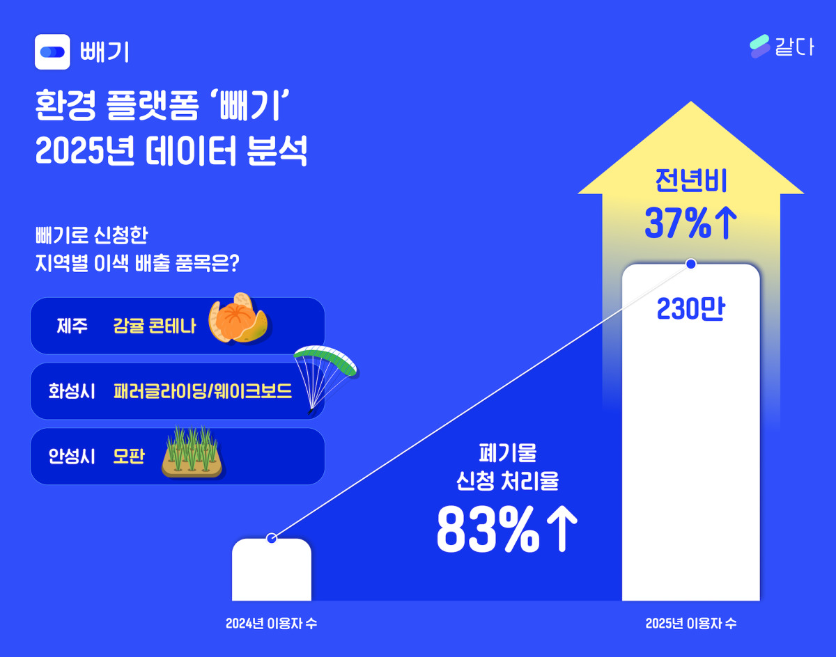 [서울=뉴스핌] 이나영 기자= 환경 자원 AI 데이터 기업 같다는 폐기물 배출 서비스 '빼기'의 이용자 수가 2025년 전년 대비 37% 증가했으며, 3040 여성이 핵심 이용층으로 나타났다고 26일 밝혔다.