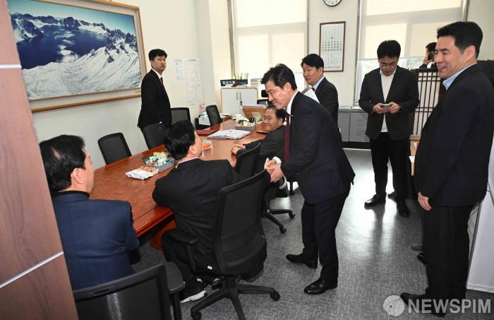 [서울=뉴스핌] 윤창빈 기자 = 국민의힘이 대구·경북(TK) 행정 통합 특별법안 처리에 대한 당의 입장을 26일 전체 TK 국회의원의 투표로 정하기로 해 국민의힘 TK 의원들이 투표를 위해 원내수석부대표실에 모여있다. 2026.02.26 pangbin@newspim.com