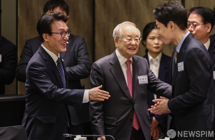 [서울=뉴스핌] 류기찬 기자 = 김민석 국무총리와 손경식 경총 회장이 26일 오후 서울 종로구 포시즌스 호텔 서울에서 열린 ‘한국경영자총협회 오찬 및 K-국정설명회’에 참석하고 있다. 2026.02.26 ryuchan0925@newspim.com