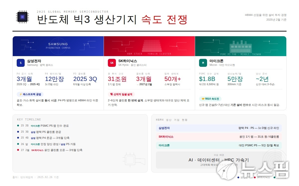 [서울=뉴스핌] 서영욱 기자 = 고성능 메모리 호황이 본격화되면서 삼성전자와 SK하이닉스를 비롯한 메모리 기업들이 클린룸 가동 시점을 앞당기고 있다. 생성형 인공지능(AI)과 데이터센터 투자 확대로 고대역폭메모리(HBM) 수요가 급증하자, 생산 능력 확보 시점이 곧 시장 주도권과 직결된다는 판단에서다. 한동안 시황을 고려해 공급 속도를 조절하던 전략에서 벗어나, 공기 단축과 조기 양산으로 방향을 틀었다는 분석이 나온다. 여기에 마이크론까지 인수 카드를 꺼내 들면서 글로벌 메모리 3사의 '시간 싸움'이 한층 치열해지는 모습이다.