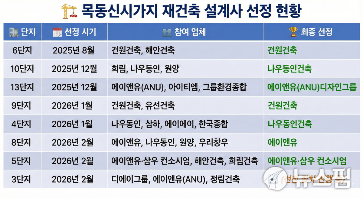 [서울=뉴스핌] 정영희 기자 = 서울 정비사업 최대어 중 하나로 꼽히는 양천구 목동 신시가지 아파트 재건축 사업이 본궤도에 오르면서 업계 전반이 달아오르고 있다. 국내외 최정상급 건축사사무소들이 프리미엄 단지 조성을 내세우며 설계 대전을 벌이는 가운데, 시공권을 따내기 위한 대형 건설사들의 '선별 수주' 전쟁도 막을 올릴 전망이다.