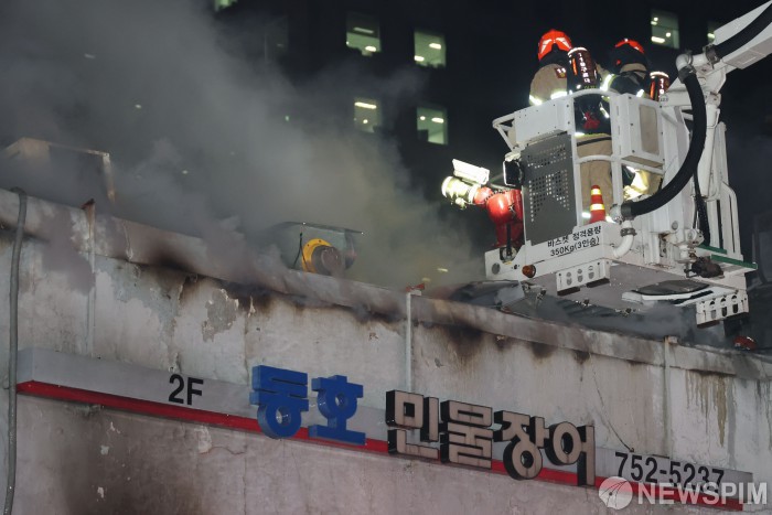 [서울=뉴스핌] 류기찬 기자 = 23일 오후 서울 중구 북창동 먹자골목 상가에서 화재가 발생해 소방대원들이 불길을 진압하고 있다. 2026.02.26 ryuchan0925@newspim.com