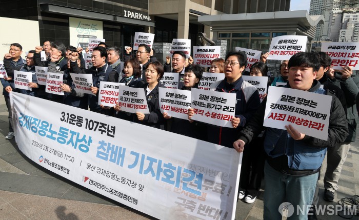 [서울=뉴스핌] 정일구 기자 = 민주노총과 한국노총 등 양대노총 조합원들이 27일 오전 서울 용산구 용산역 강제징용 노동자상 앞에서 3.1운동 107주년 강제징용 노동자상 합동 참배 기자회견을 열고 구호를 외치고 있다. 2026.02.27 mironj19@newspim.com