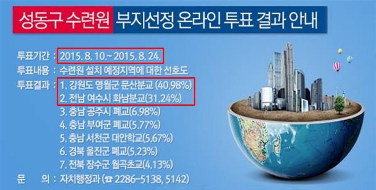이에 대해 정 구청장은 온라인 주민투표로 결정됐다고 반박했다. 관련해 "전국 652개 폐교를 전수 조사한 뒤 2015년 성동구민 1만395명이 직접 참여한 온라인 주민투표를 통해 선정됐다"고 했다. 당시 힐링센터로 2곳을 선정하기로 했고, 1위·2위인 영월폐교와 여수폐교 두 곳을 순차적으로 힐링센터로 지정했다는 설명이다.