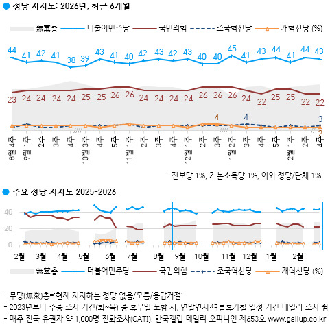 정당 지지도는 더불어민주당이 43%, 국민의힘은 22%, 조국혁신당은 3%, 개혁신당은 2% 순으로 나타났다.