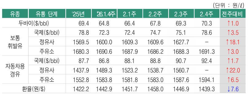 지난주(2월 3주) 정유사 휘발유 공급가격은 전주보다 18.1원 상승한 리터당 1627.7원, 경유 공급가격은 22.0원 상승한 리터당 1560.7원으로 집계됐다.