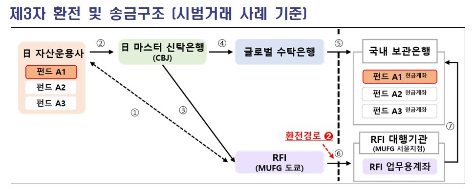 이번 거래는 일본 현지의 한 자산운용사가 마스터 신탁은행(CBJ)과 글로벌 수탁은행을 통해 결제 정보를 전달하면서도, 원화는 일본 현지의 RFI(MUFG)를 통해 별도로 환전해 국내 보관은행에 환전대금을 직접 송금하는 형태로 진행됐다.