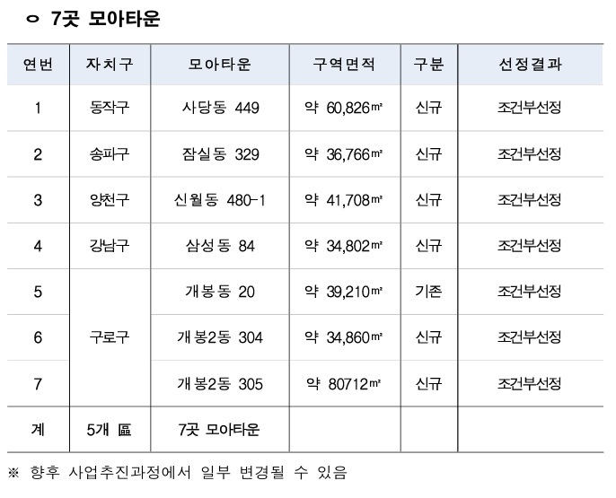 [서울=뉴스핌] 조수민 기자 = 서울시는 구로구 개봉동, 송파구 잠실동 등 총 7곳을 서울주택도시개발공사(SH) 참여 모아타운 최종 대상지로 선정했다고 27일 밝혔다.