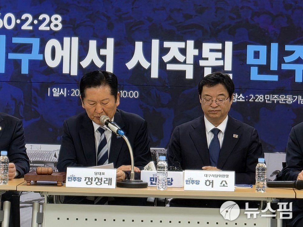 정 대표는 "국민의힘의 무책임으로 대구·경북 행정 통합이 무산 위기에 있다. 만약 행정 통합이 무산된다면 100% 국민의힘 책임"이라고 강조하고 "(국민의힘) 당 지도부가 석고대죄해야 한다"고 주장했다.