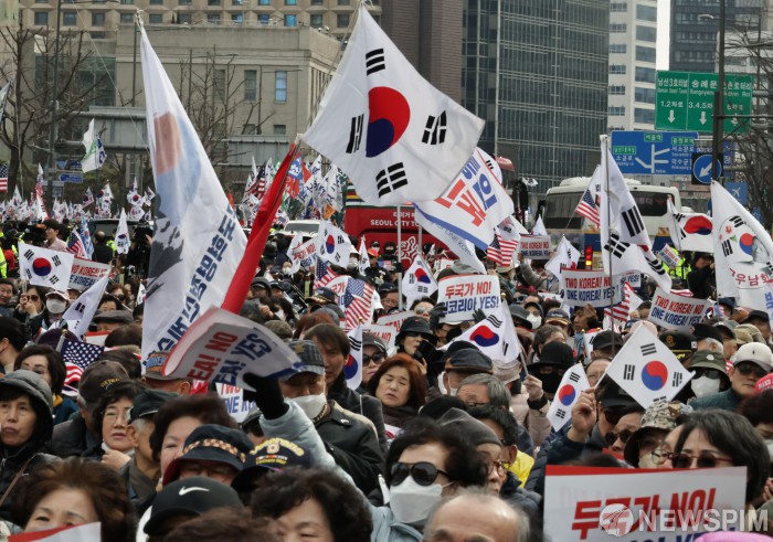 [서울=뉴스핌] 양윤모 기자 = 제107주년 3·1절인 1일 오후 보수단체 집회인 원코리아 범국민대회가 서울 광화문 동화면세점 앞에서 열렸다. 2026.03.01 yym58@newspim.com