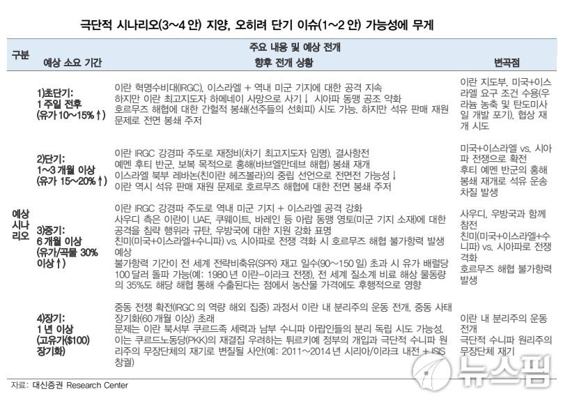 대신증권은 "단기적으로 유가 변동성 확대는 불가피하나, 제한적 전쟁과 OPEC+ 증산 재개 가능성을 고려하면 불확실성은 최대 3개월 이내에 진정될 수 있다"며 "유가에 대한 기존의 보수적 접근을 유지할 필요가 있다"고 밝혔다