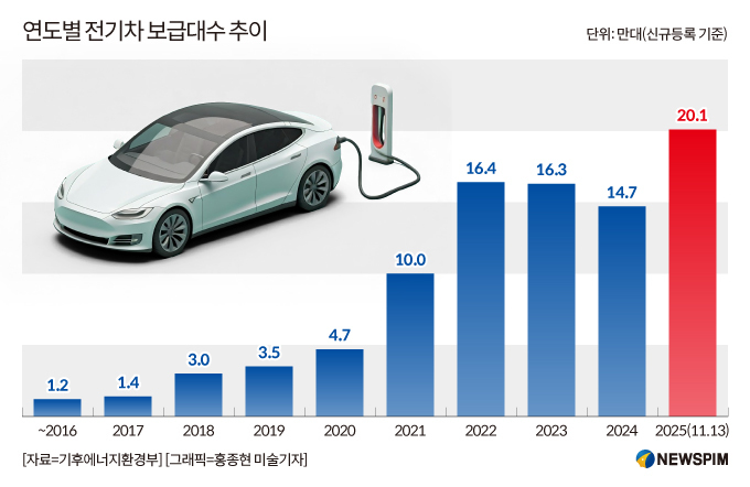3일 기후에너지환경부 등에 따르면 국내 전기차 누적 등록 대수는 86만9739대(지난해 10월 기준)로, 최근 5년간 연평균 30% 이상 성장했다. 연간 전기차 보급 대수도 약 20만대(지난해 11월 기준)를 기록했다. 이는 연간 최대 보급 실적이었던 2022년 16만4000대를 크게 웃도는 수치다.