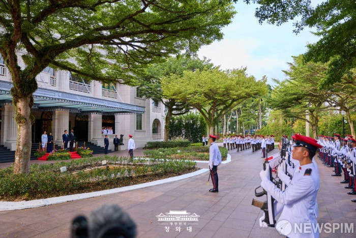 [서울=뉴스핌] 이재명 대통령이 지난 2일 싱가포르 외교부 청사에서 열린 국빈방문 공식환영식에서 의장대를 사열하고 있다. [사진=청와대] 2026.03.03 photo@newspim.com