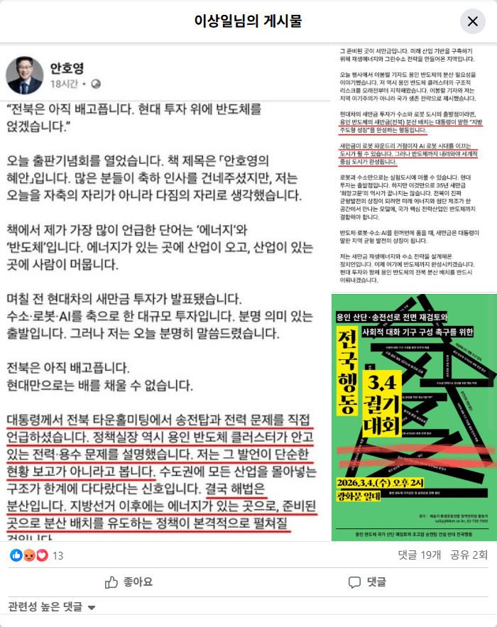안호영 의원은 "현대차 새만금 투자가 수소·로봇 도시 출발점이라면 용인 반도체 분산이 지방성장 완성"이라며, 2월 27일 전북 타운홀 미팅에서 대통령이 송전탑·전력 문제를 언급한 점을 들어 "분산 해법, 지방선거 후 에너지 있는 곳으로 유도"라고 장담했다.