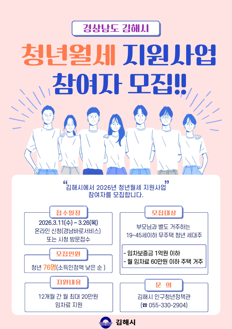 [김해=뉴스핌] 남경문 기자 = 경남 김해시는 오는 11일부터 26일까지 '2026년 김해시 청년 월세 지원사업' 참여자 76명을 모집한다고 4일 밝혔다.