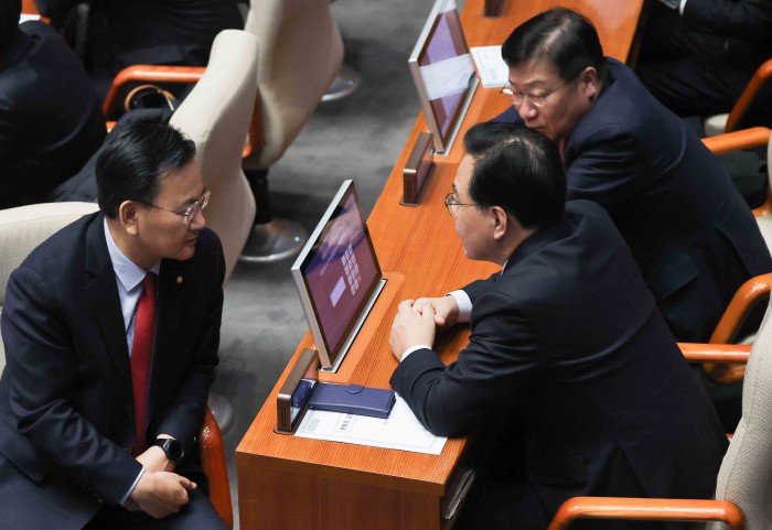 [서울=뉴스핌] 윤창빈 기자 = 송언석 국민의힘 원내대표, 정점식 정책위의장, 유상범 원내수석부대표가 15일 서울 여의도 국회에서 열린 본회의에서 대화를 나누고 있다. 2026.01.15 pangbin@newspim.com