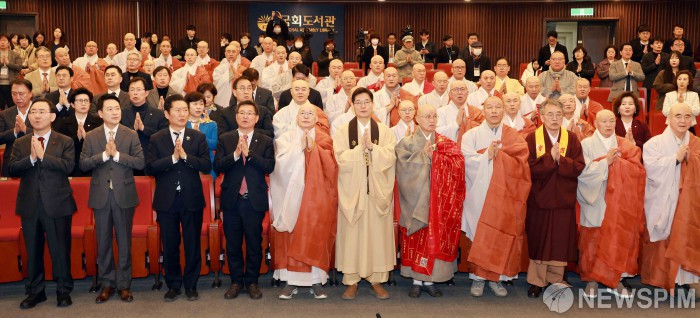[서울=뉴스핌] 윤창빈 기자 = 정청래 더불어민주당 대표와 장동혁 국민의힘 대표가 4일 국회 도서관에서 열린 2026 국회정각회 신춘법회에 참석해 합장하고 있다. 2026.03.04 pangbin@newspim.com