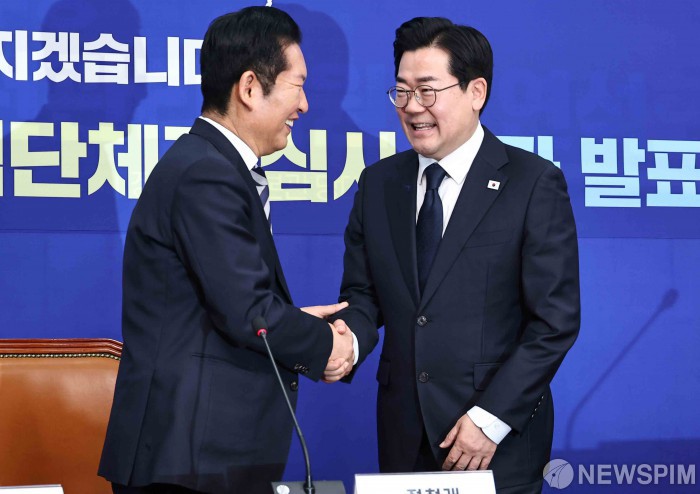 [서울=뉴스핌] 윤창빈 기자 = 정청래 더불어민주당 대표가 4일 오전 서울 여의도 국회에서 6·3 지방선거 인천시장 후보에 단수 공천한 박찬대 의원과 악수하고 있다. 2026.03.04 pangbin@newspim.com