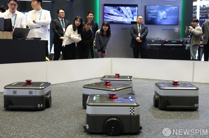 [서울=뉴스핌] 김현우 기자 = 4일 오전 서울 강남구 코엑스에서 열린 2026 스마트공장·자동화산업전(AW2026)에서 현대무벡스 '자율주행 물류로봇(AMR)'이 군집 퍼레이드 시연을 하고 있다. 2026.03.03 khwphoto@newspim.com