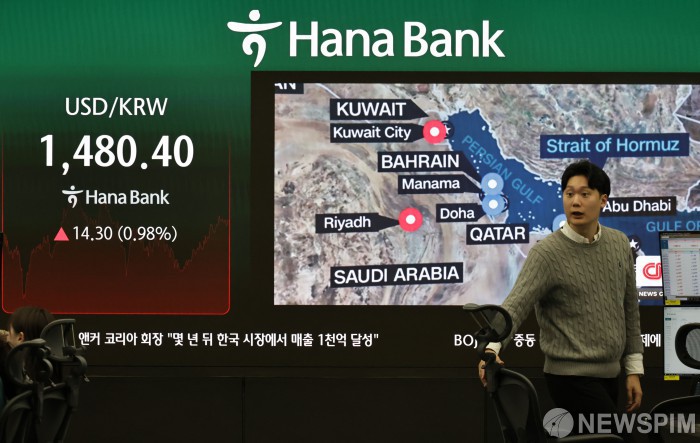 [서울=뉴스핌] 양윤모 기자= 이란 사태 장기화 우려속 4일 오후 서울외환시장에서 달러/원 환율은 전장 대비 14.30원 상승한 1480.40원에 거래되는 가운데, 서울 중구 하나은행 을지로본점 딜링룸에서 직원들이 업무를 보고 있다. 2026.03.04 yym58@newspim.com