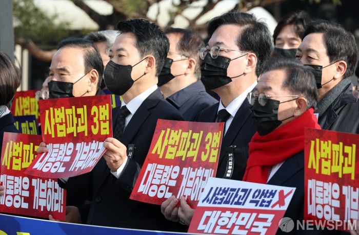[서울=뉴스핌] 정일구 기자 = 장동혁 국민의힘 대표와 송언석 원내대표가 5일 오전 서울 종로구 청와대 분수대 앞에서 열린 현장 의원총회에서 소속 의원들과 손피켓을 들고 있다. 2026.03.05 mironj19@newspim.com