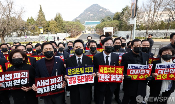 [서울=뉴스핌] 정일구 기자 = 장동혁 국민의힘 대표와 송언석 원내대표가 5일 오전 서울 종로구 청와대 분수대 앞에서 열린 현장 의원총회를 마친 뒤 손피켓을 들고 청와대 앞에서 침묵시위를 하고 있다. 2026.03.05 mironj19@newspim.com