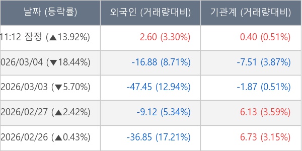 [서울=뉴스핌] 로보뉴스 = 05일 11시 30분 현재 에코프로머티(450080)는 외국인과 기관이 각각 2.60 만 주, 0.40 만 주 순매수(잠정) 하면서 전일 대비 13.92% (현재가 63,000원) 상승하고 있다.