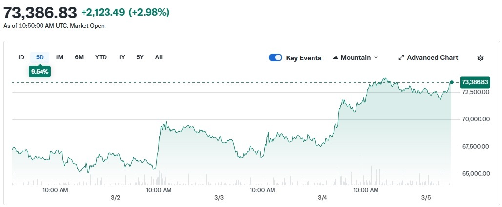 [서울=뉴스핌] 고인원 기자= 비트코인이 중동 전쟁 충격을 딛고 7만3000달러선을 돌파했다. 전쟁 확전 우려가 다소 완화되고 미국 비트코인 현물 상장지수펀드(ETF)로 기관 자금이 유입되면서 위험자산 선호 심리가 다시 살아난 영향이다.
