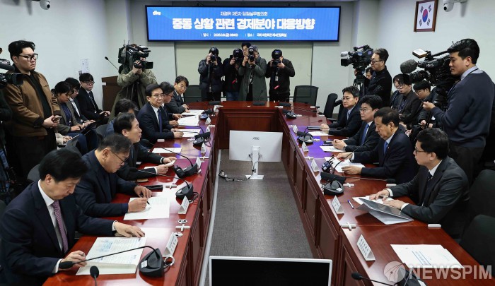 [서울=뉴스핌] 윤창빈 기자 = 6일 오전 서울 여의도 국회 의원회관에서 중동 상황 관련 경제분야 대응방향을 주제로 재정경제위원회 제5차 당정실무협의회가 열리고 있다. 2026.03.06 pangbin@newspim.com