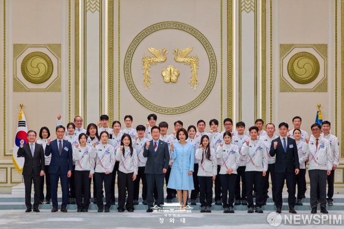 [서울=뉴스핌] 이재명 대통령과 김혜경 여사가 지난 5일 서울 청와대에서 열린 동계올림픽 선수단 격려 오찬에서 선수들과 기념촬영을 하고 있다. [사진=청와대] 2026.03.06 photo@newspim.com