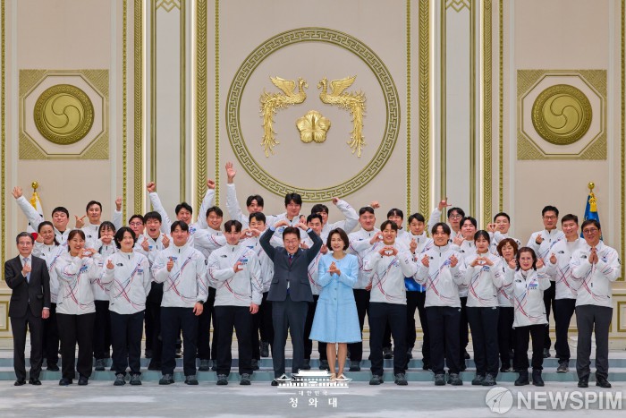 [서울=뉴스핌] 이재명 대통령과 김혜경 여사가 지난 5일 서울 청와대에서 열린 동계올림픽 선수단 격려 오찬에서 선수들과 기념촬영을 하고 있다. [사진=청와대] 2026.03.06 photo@newspim.com