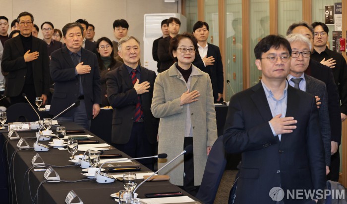 [서울=뉴스핌] 양윤모 기자 = 국가교육위원회주최 'AI 전환 시대 국가교육 비전 포럼'이 6일 오전 서울 중구 프레스센터 매화홀에서 차정인 위원장이 참석한 가운데 참석자들이 국민의례를 하고 있다. 2026.03.06 yym58@newspim.com